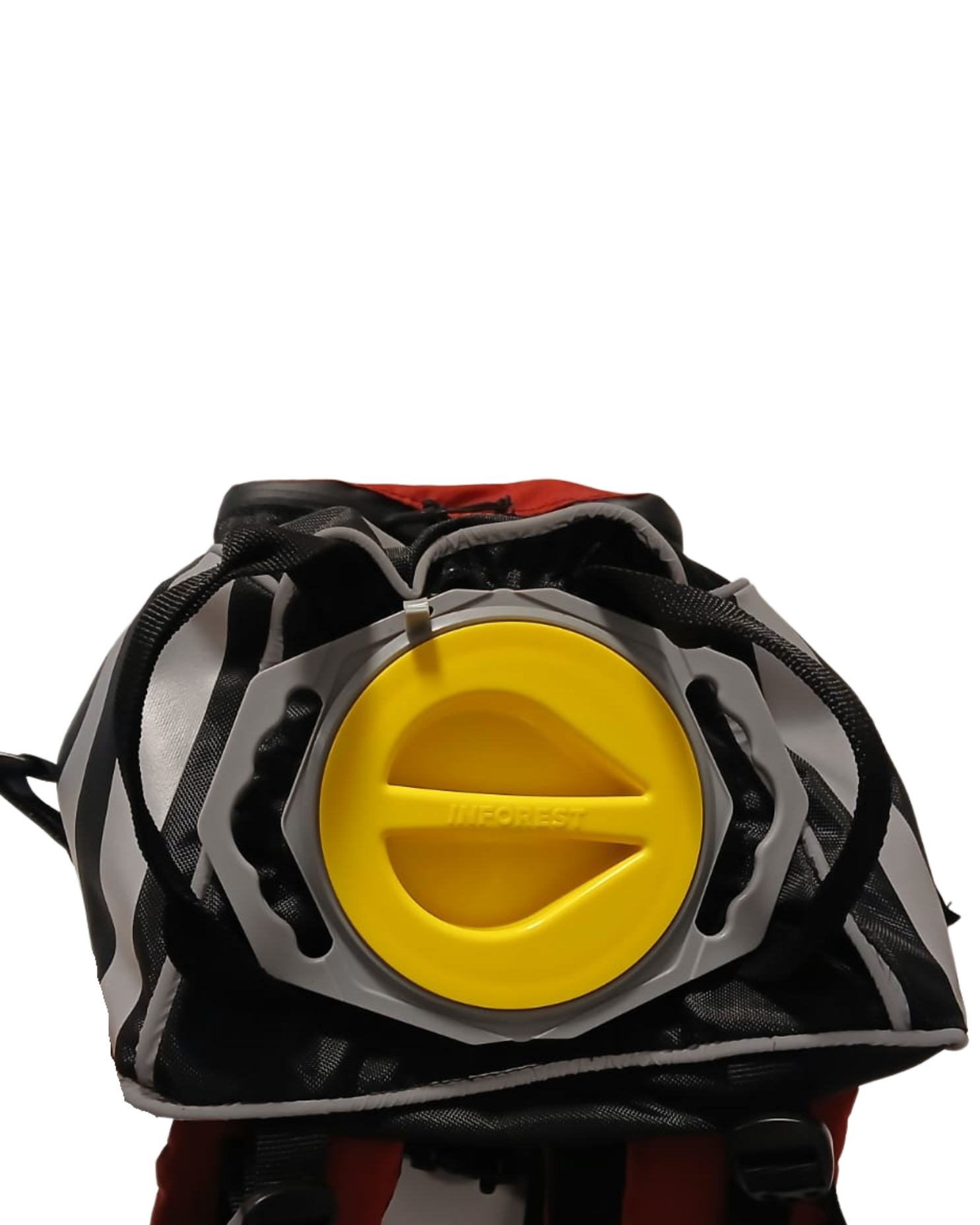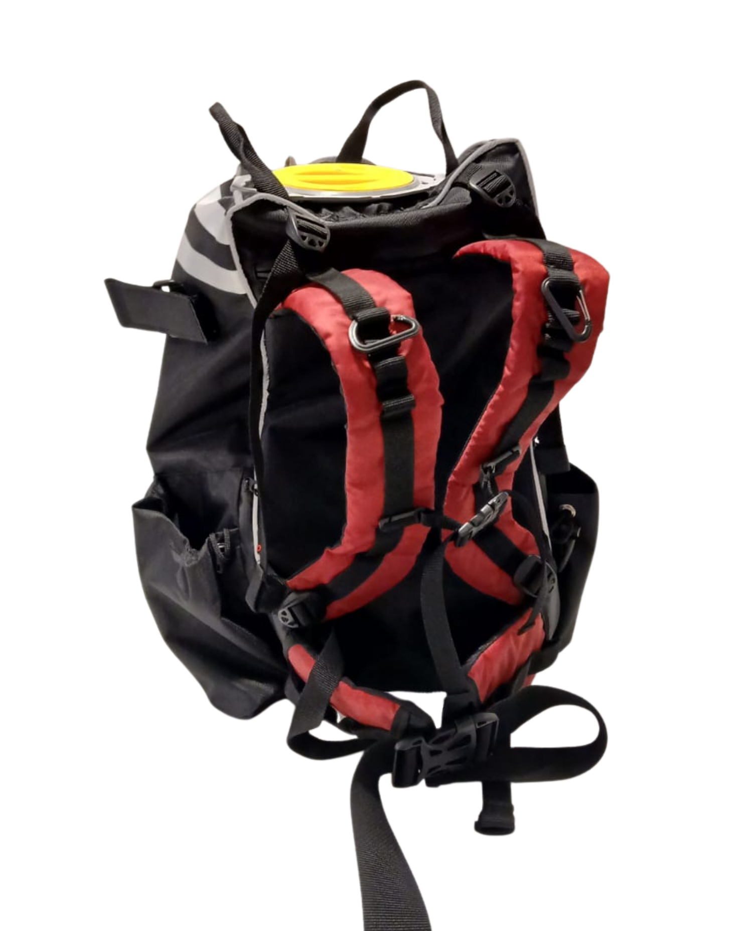 La mochila se presenta acople rápido de bronce y 3 sistemas de sujeción regulables: Cinturón abdominal, de pecho y cintos ajustables de hombros.